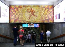 Валентина Терешкова, первая женщина в космосе, увековечена на станции "Космонавтов". Черно-синяя панель имитирует вид Земли с космоса.