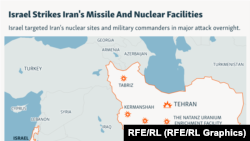 ВВС Израиля нанесли удары по целям в Тегеране, Тебризе, Керманшахе, Исфахане, Натанзе, где находится главный иранский завод по обогащению урана. В Тегеране и его окрестностях объектами атак стали по меньшей мере шесть военных баз и два жилых комплекса высшего военного командования Ирана. По данным ЦАХАЛ, кроме того, был нанесен масштабный удар по средствам ПВО на западе Ирана, в результате чего были уничтожены десятки радаров и пусковых установок ракет класса "земля-воздух". Как пишет госагентство IRNA, только в столице во время ударов погибли не менее десятка мирных жителей.